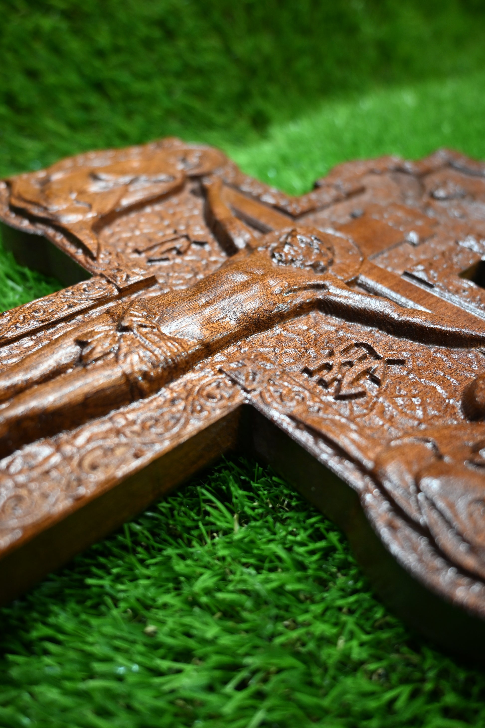 This beautiful cross in rich sapele wood features intricate detailing, highlighting the depth and texture of the design. The elegant reddish-brown tones of the hardwood give the piece a warm, traditional feel. Each crucifix is handcrafted, ensuring every piece is one of a kind.