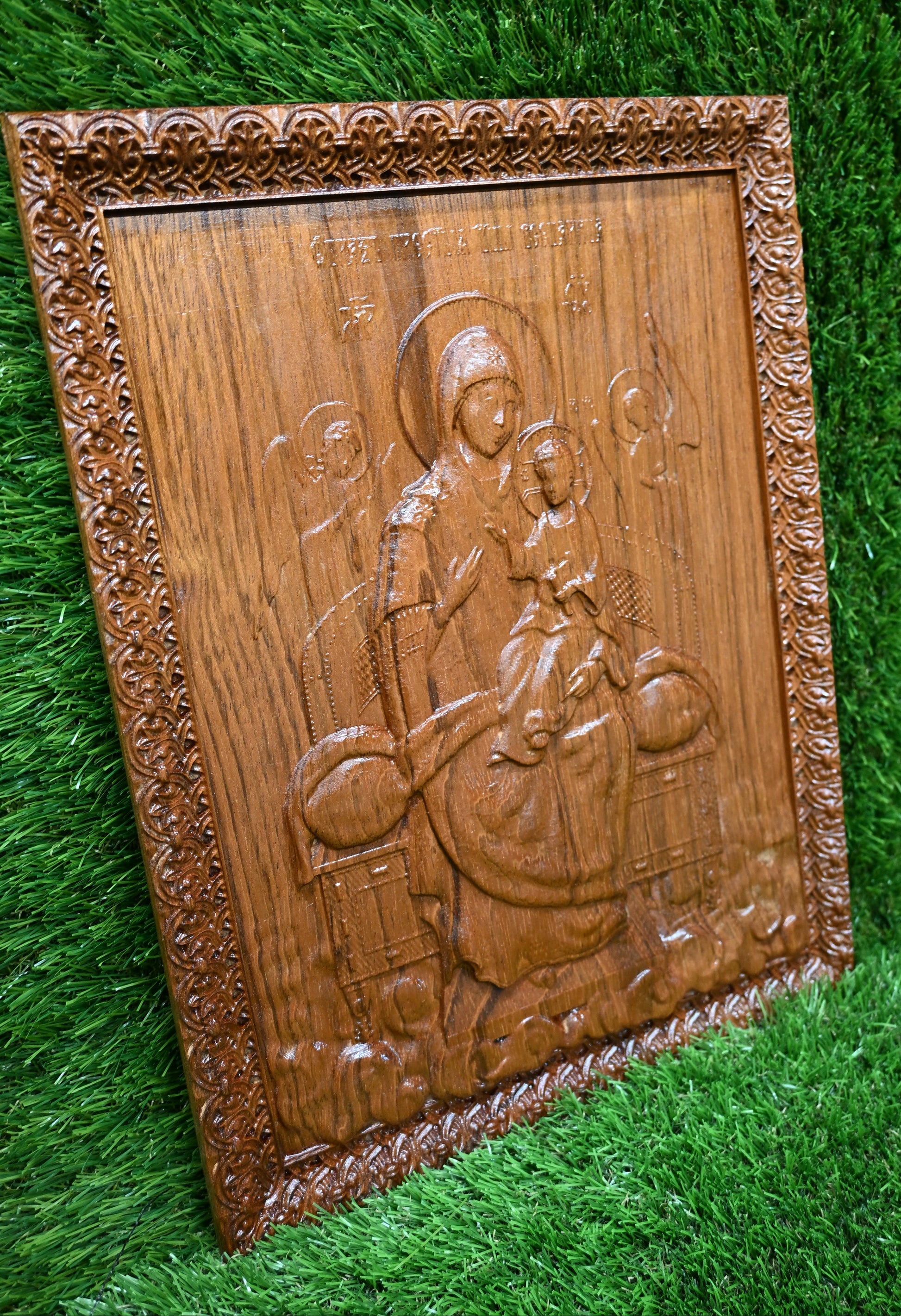 Each line and contour is carefully carved, giving depth and dimension to the scene while maintaining the traditional elegance of classic iconography. The wood is sanded to a smooth finish and sealed with a protective clear lacquer, enhancing its natural luster and preserving the fine craftsmanship.
