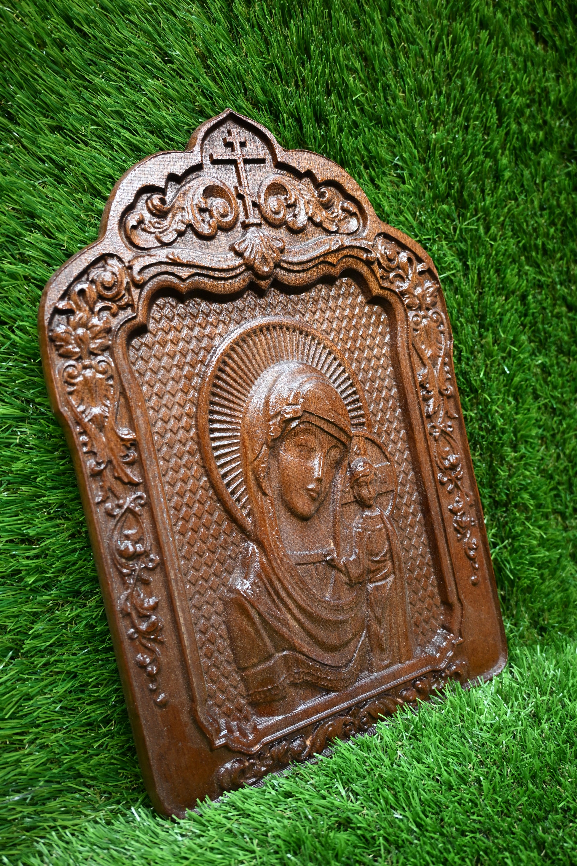 Every detail — from the delicate halos to the ornate frame — is carved with precision, creating a visually striking icon that feels both traditional and timeless. The wood is carefully sanded and finished with a protective clear lacquer, enhancing its natural depth while preserving the fine carved details.