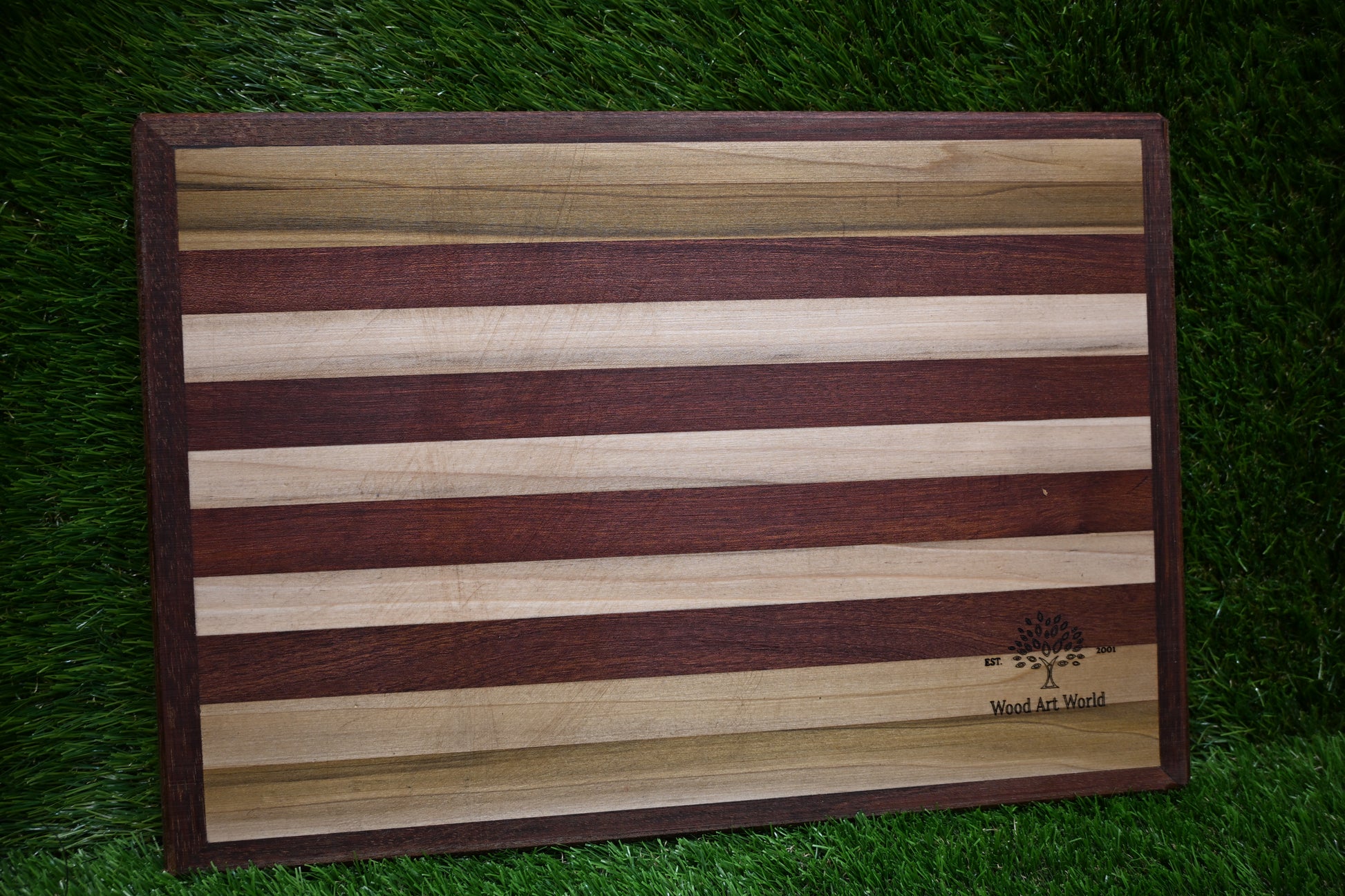 This elegant handcrafted chopping board is made from a combination of premium hardwoods, each chosen for its strength, durability, and natural beauty. The alternating tones of the wood create a striking striped pattern, making this board both a functional kitchen essential and a decorative statement piece.