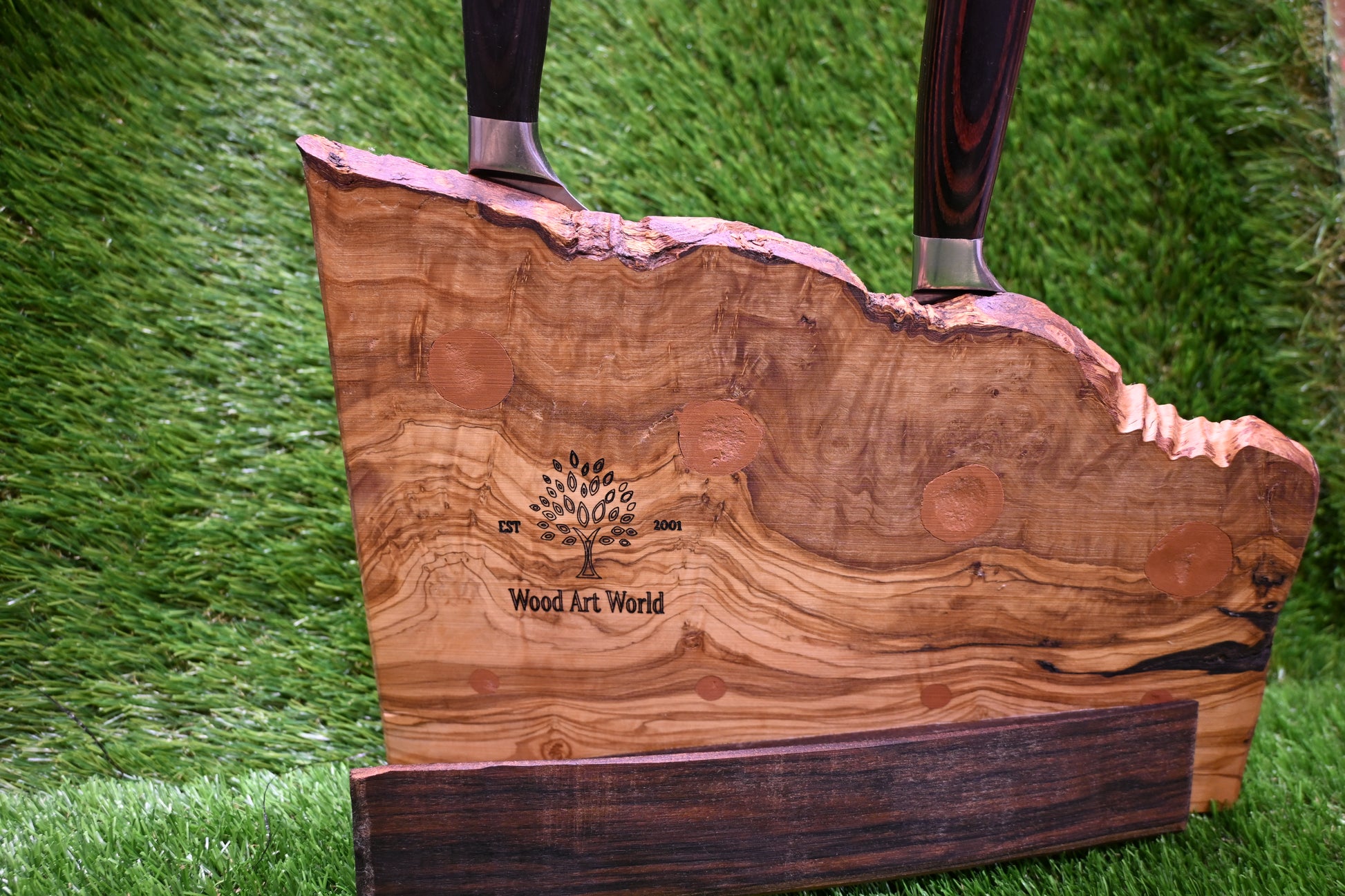 This stunning handcrafted magnetic knife holder is made from premium Olive & Walnut Wood, known for its remarkable grain patterns, durability, and golden-brown tones. The natural live edge preserves the organic beauty of the wood, making every piece truly unique.