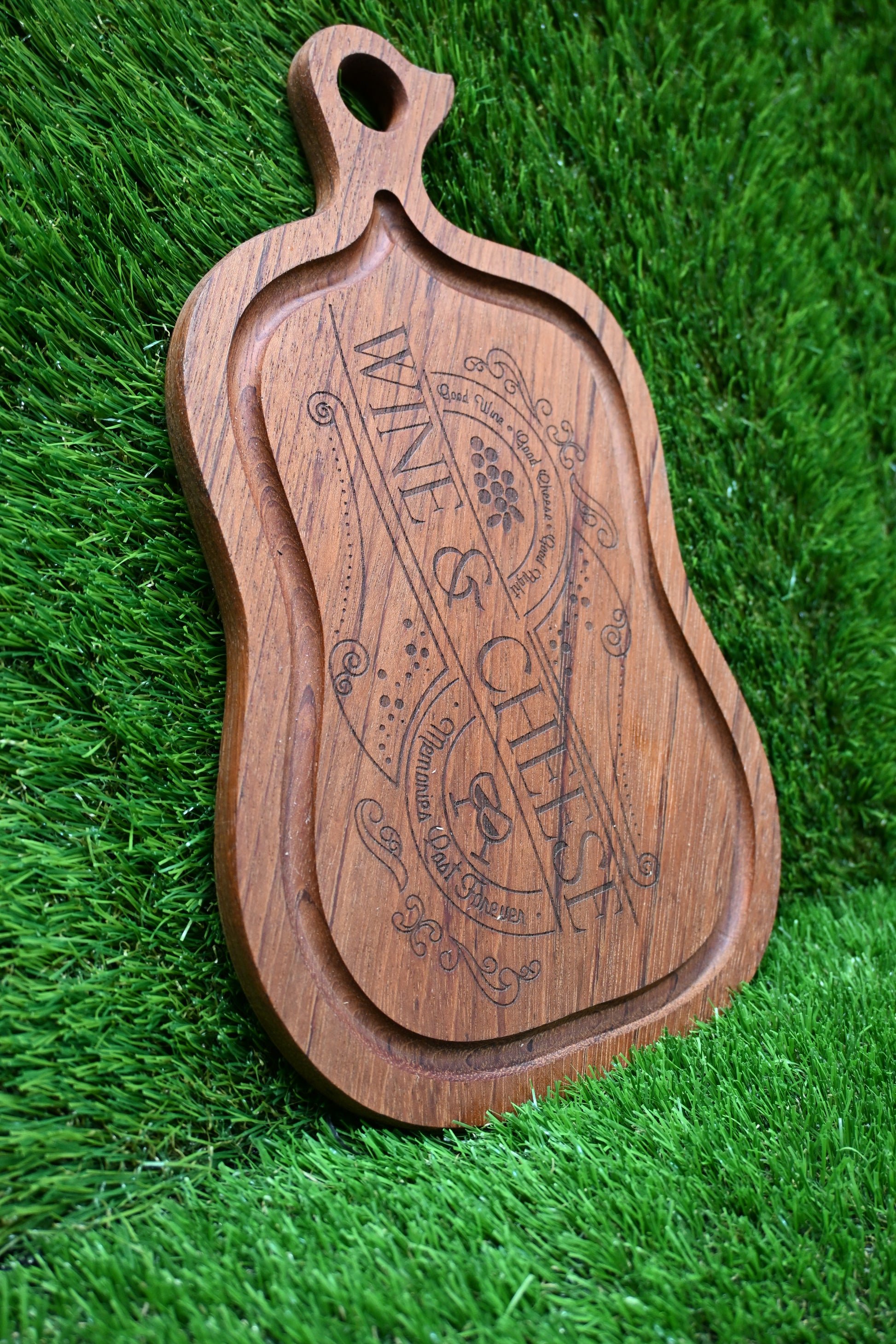 The engraved design adds a subtle artistic detail, while the smooth carved edges highlight the craftsmanship behind each handmade board.