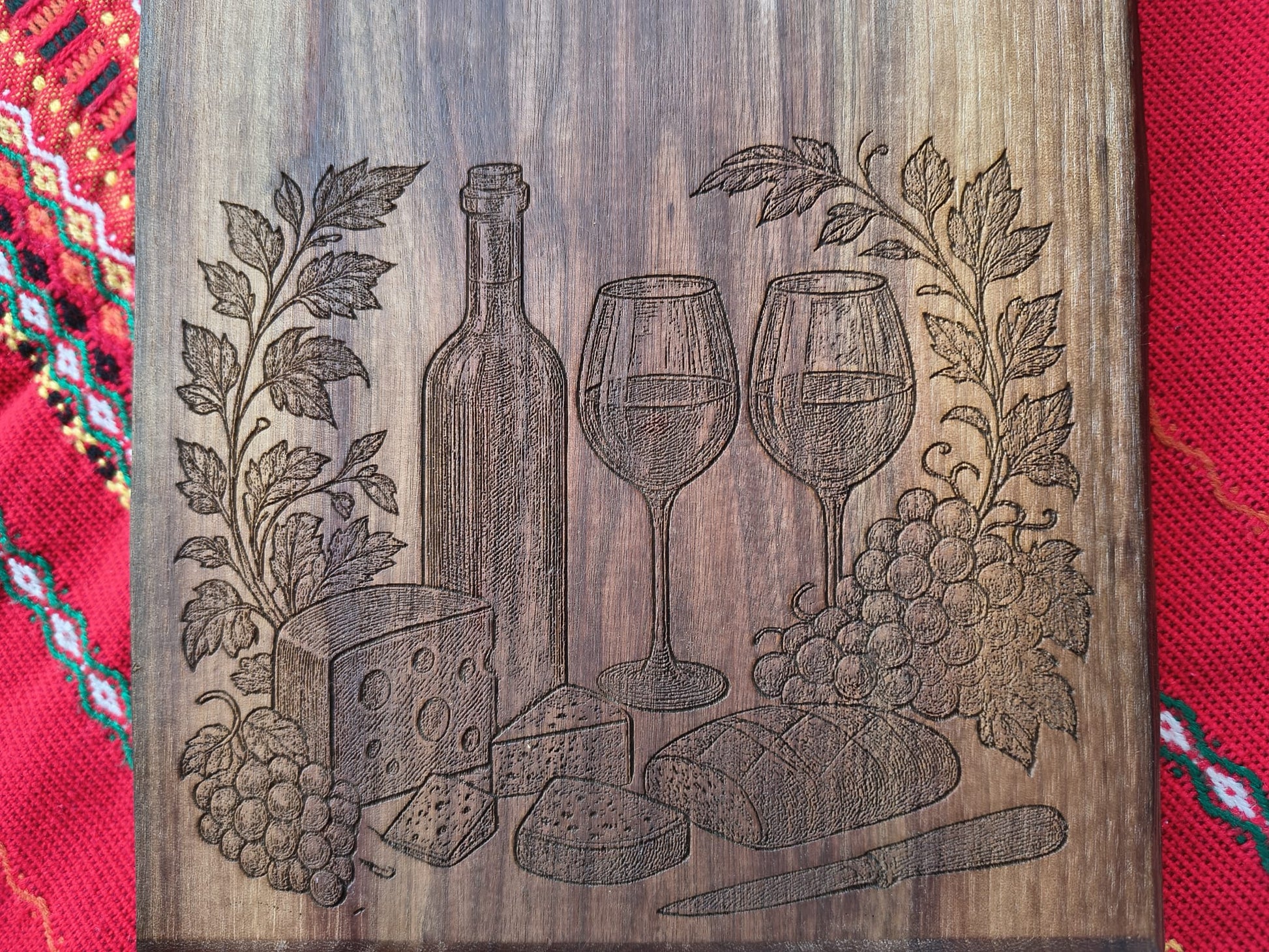 This exquisite board is made from premium solid walnut – a wood celebrated for its strength, rich color, and unique grain patterns. The surface is decorated with an artistic engraving of a wine bottle, two elegant glasses, cheese, grapes, and bread – timeless symbols of coziness, flavor, and cherished moments.