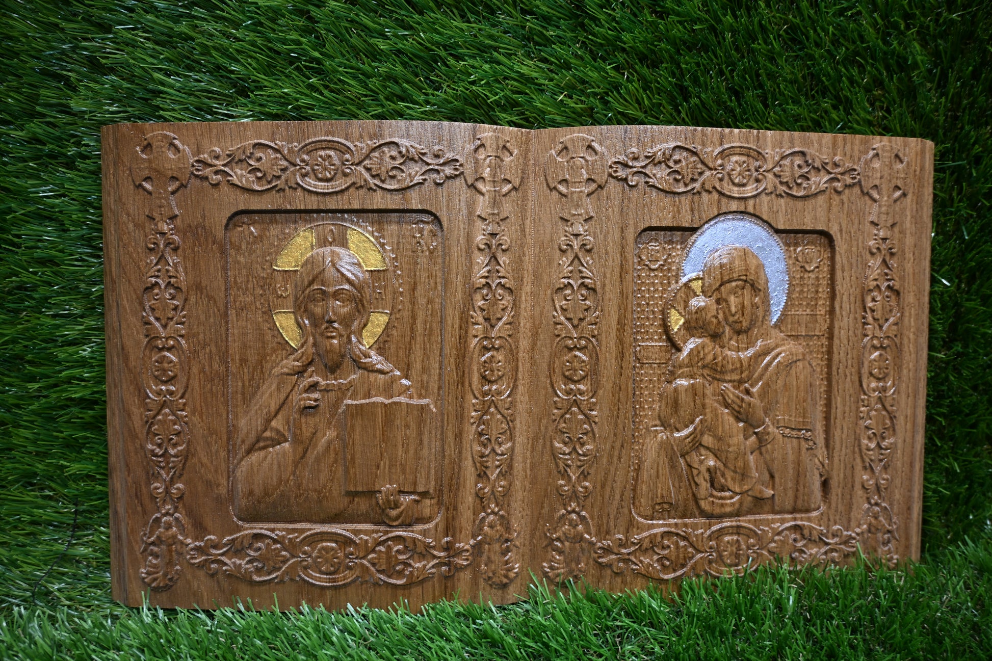 This beautifully carved double page book icon is crafted from oak, showcasing two detailed religious scenes framed with ornate border work. The natural oak grain enhances the depth and warmth of the carving, making this a refined and meaningful decorative piece for any interior.